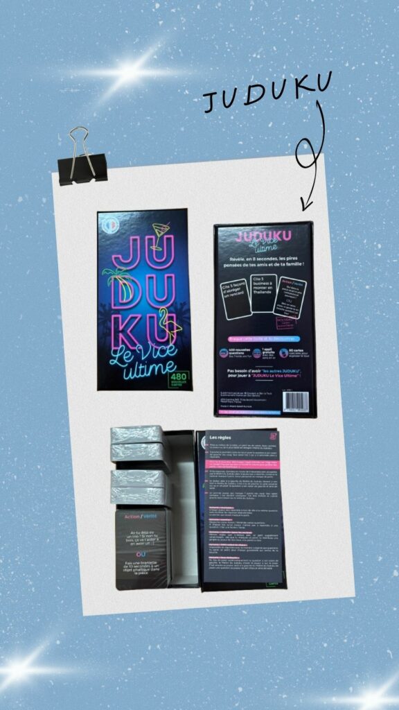 « Juduku – Le Vice Ultime » est un jeu d’ambiance audacieux, conçu pour ceux qui aiment sortir des sentiers battus, rire fort, et provoquer un peu. Pour des soirées entre amis adultes bien dans l’esprit, c’est un très bon choix — il peut casser la glace, déclencher des anecdotes inattendues, ou simplement offrir des fous rires.