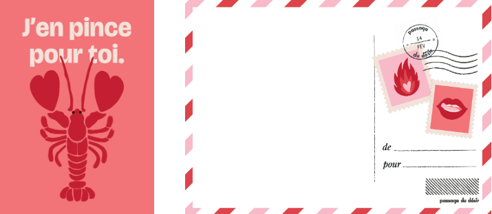 - « J’en pince pour toi » : Un homard rouge vif, pinces en cœur.